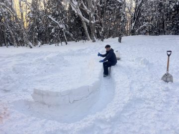 雪のブロックを重ねて作る「イグルー」や、雪でテーブルカウンターとベンチを設置しました。まだ完成ではありませんが今日はここまで。